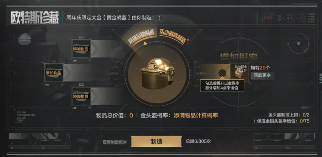 还有【白银战盔】、【黄金战盔枪械挂饰体验卡】、【3-5级装备头盔】、【柯恩币】等诸多奖励!制造时可选择添加【欧特斯金矿】,更能提升获得【黄金战盔】、【白银战盔】的概率!