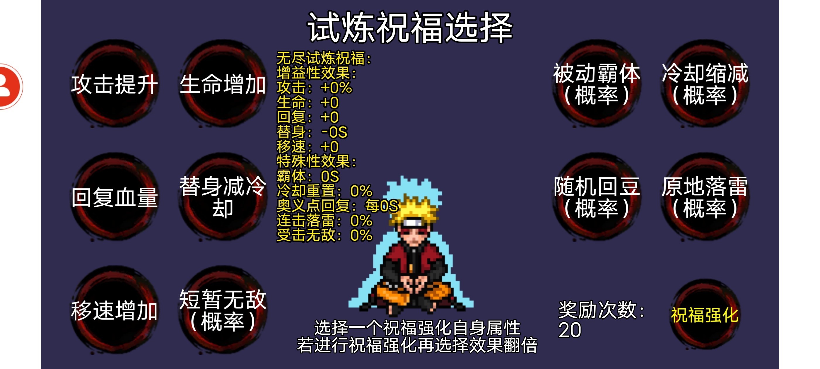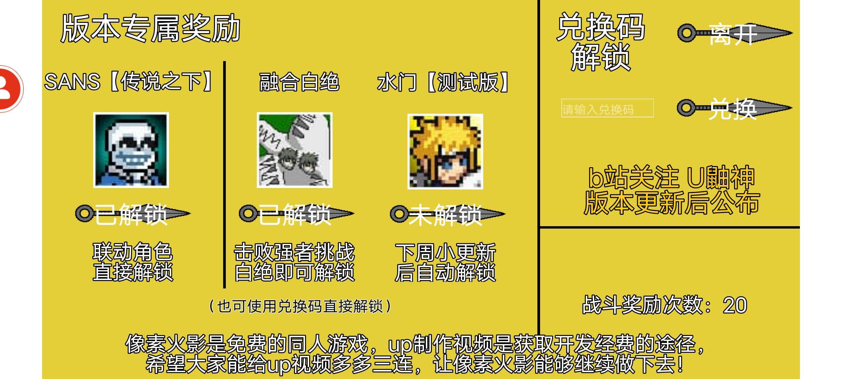 另外无尽试炼也有新的兑换码,输入兑换码:【像素火影】,即可获得20次战斗回血和双倍祝福的福利。
