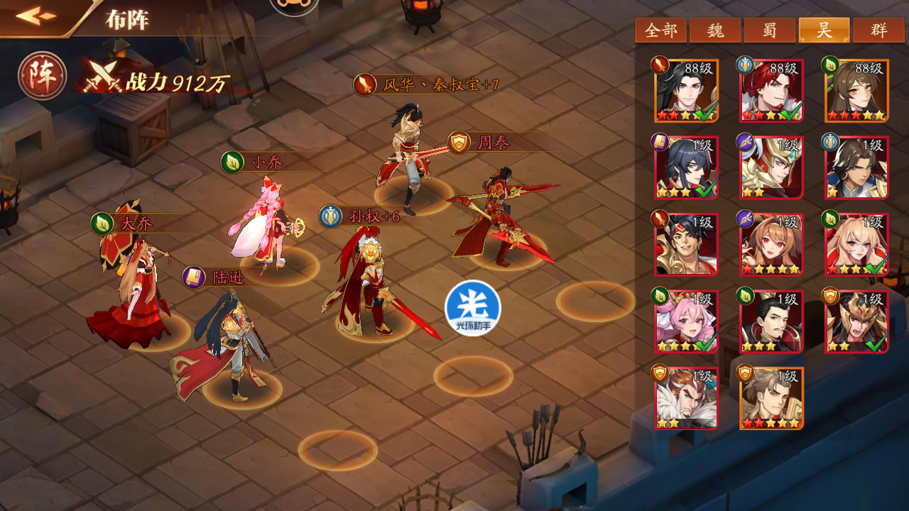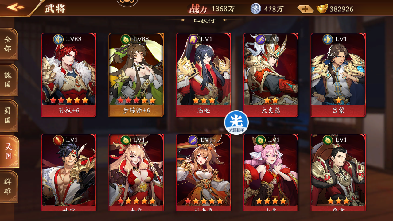 这时候就可以全部本国红将上阵了,因为主要任务是过副本,所以要考虑群攻多、PVE强的武将。