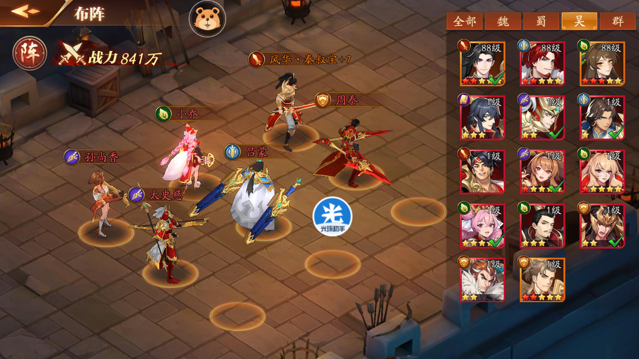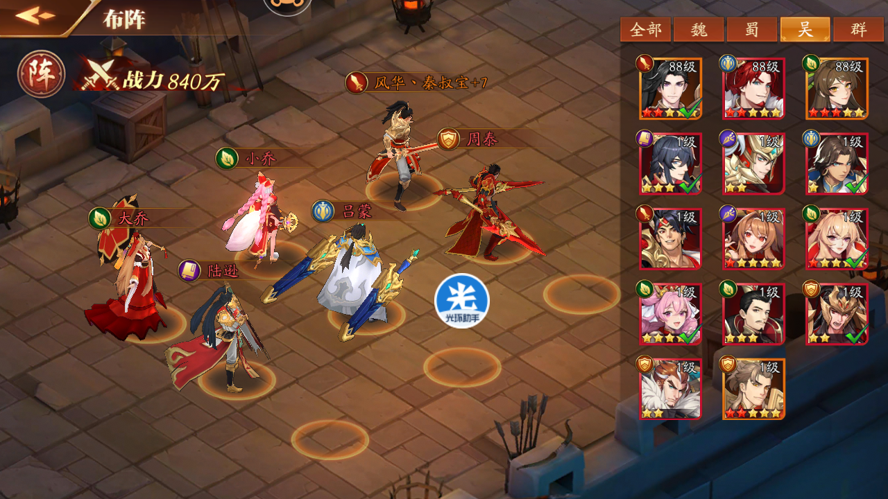 陆逊、小乔二人组是法攻队固定组合,靠小乔的技能帮助陆逊提高法攻伤害。周泰、许褚在前面吃伤害。吕蒙有增伤,同时可以对血最少敌人进行精准打击,配合“光环叔宝出品”陆逊很容易造成对方减员。大乔的辅助在PVP中比较有用,有加速、对敌减速、带击倒,6星后更有治疗专属技能,可以弥补小乔治疗不足的痛处,同样也是群体攻击。如果孙权高星,也可以代替吕蒙。