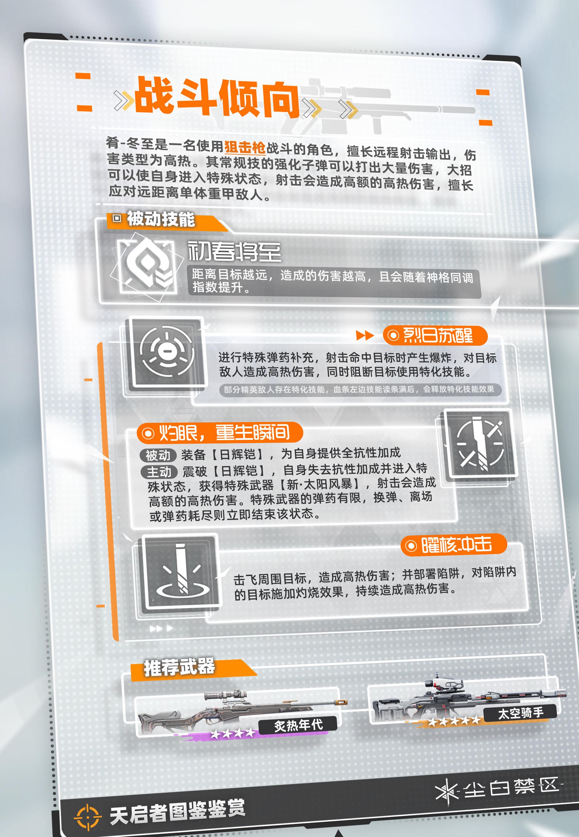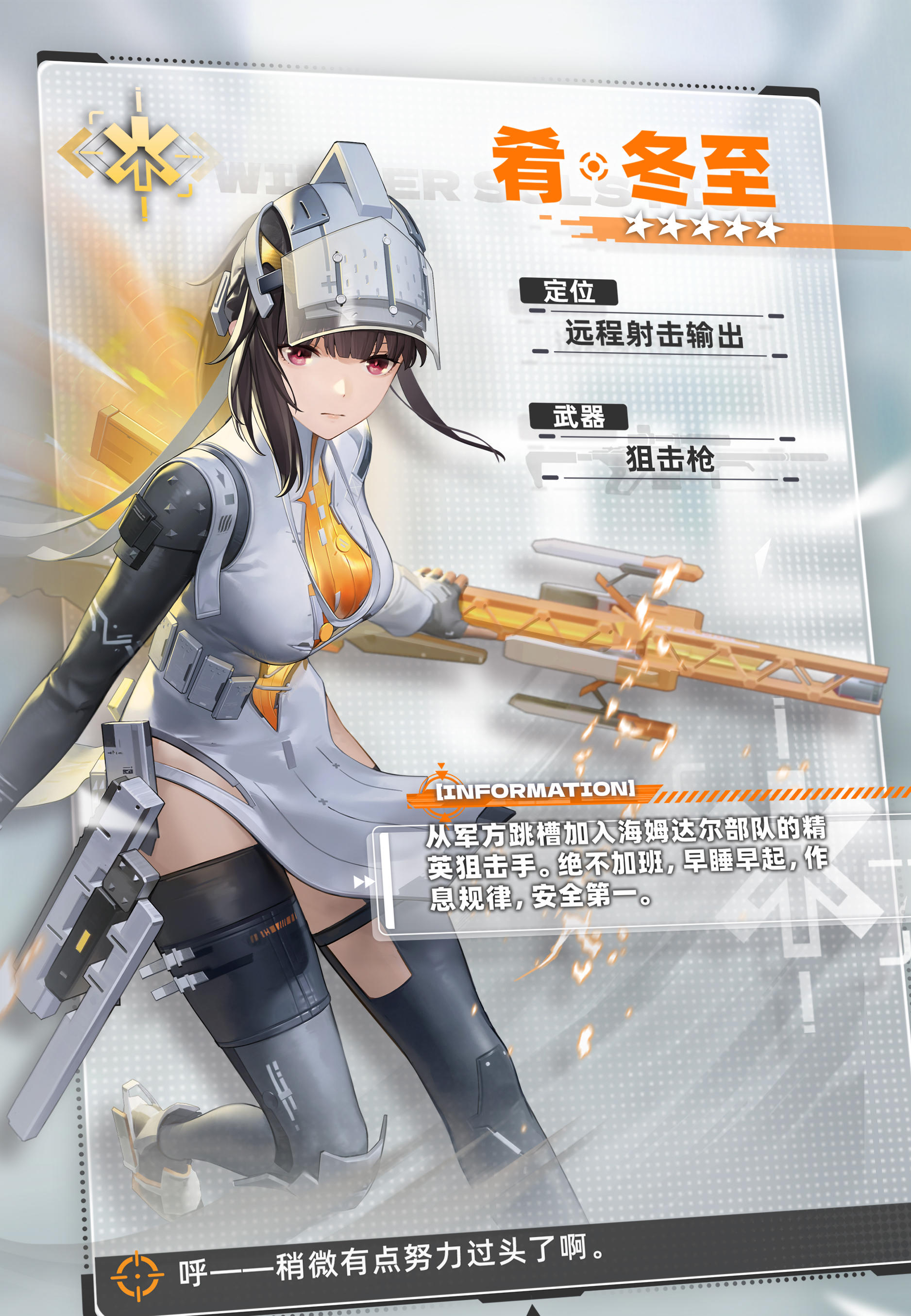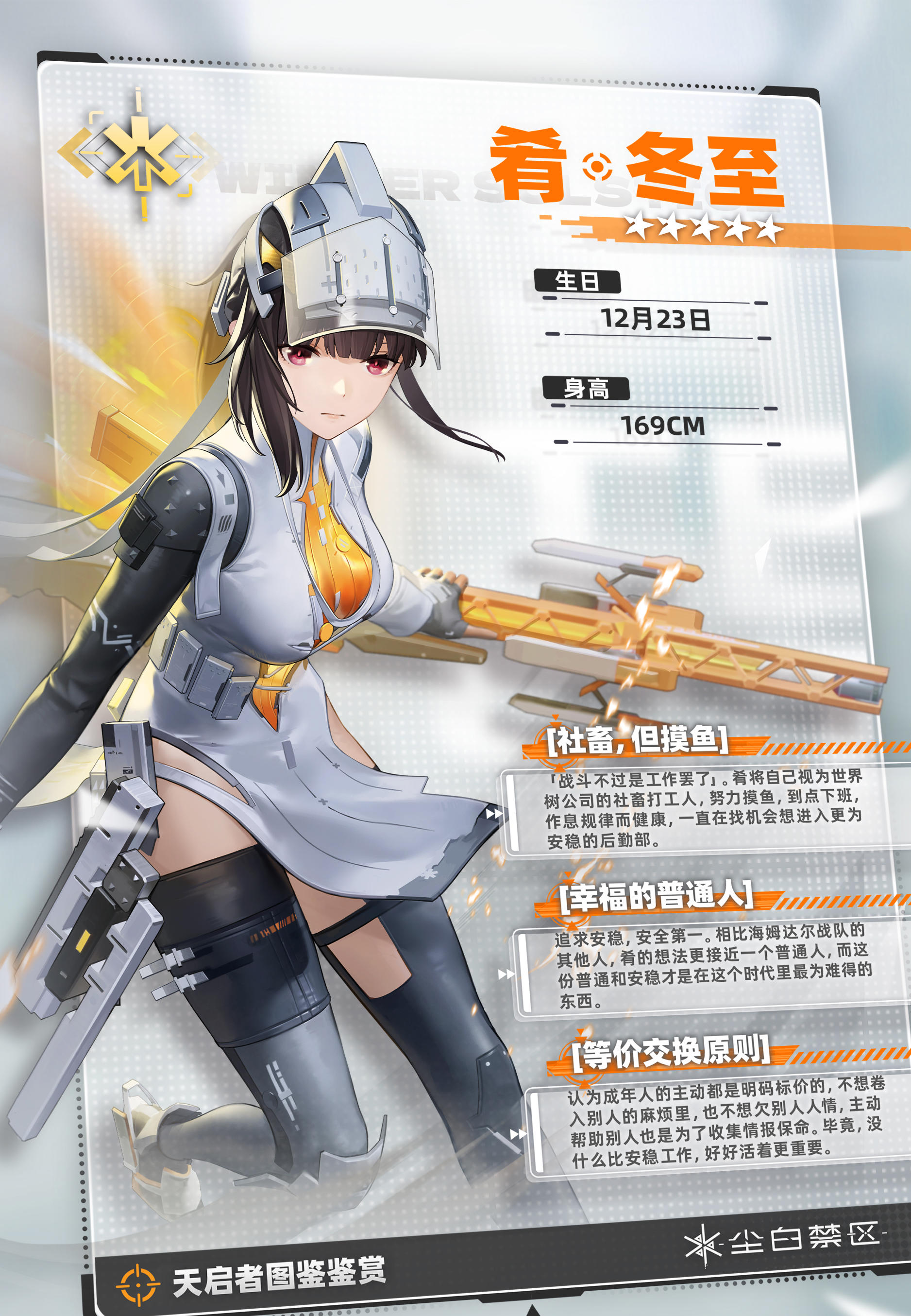 「天启者图鉴鉴赏-冬至」猫咪💫发布于 2023-07-14关注肴-冬至 Winter Solstice从军方跳槽加入海姆达尔部队的精英狙击手。绝不加班,早睡早起,作息规律,安全第一。“呼——稍微有点努力过头了啊。”《尘白禁区》将于7月20日10:00开启全平台公测,期待与分析员相见!