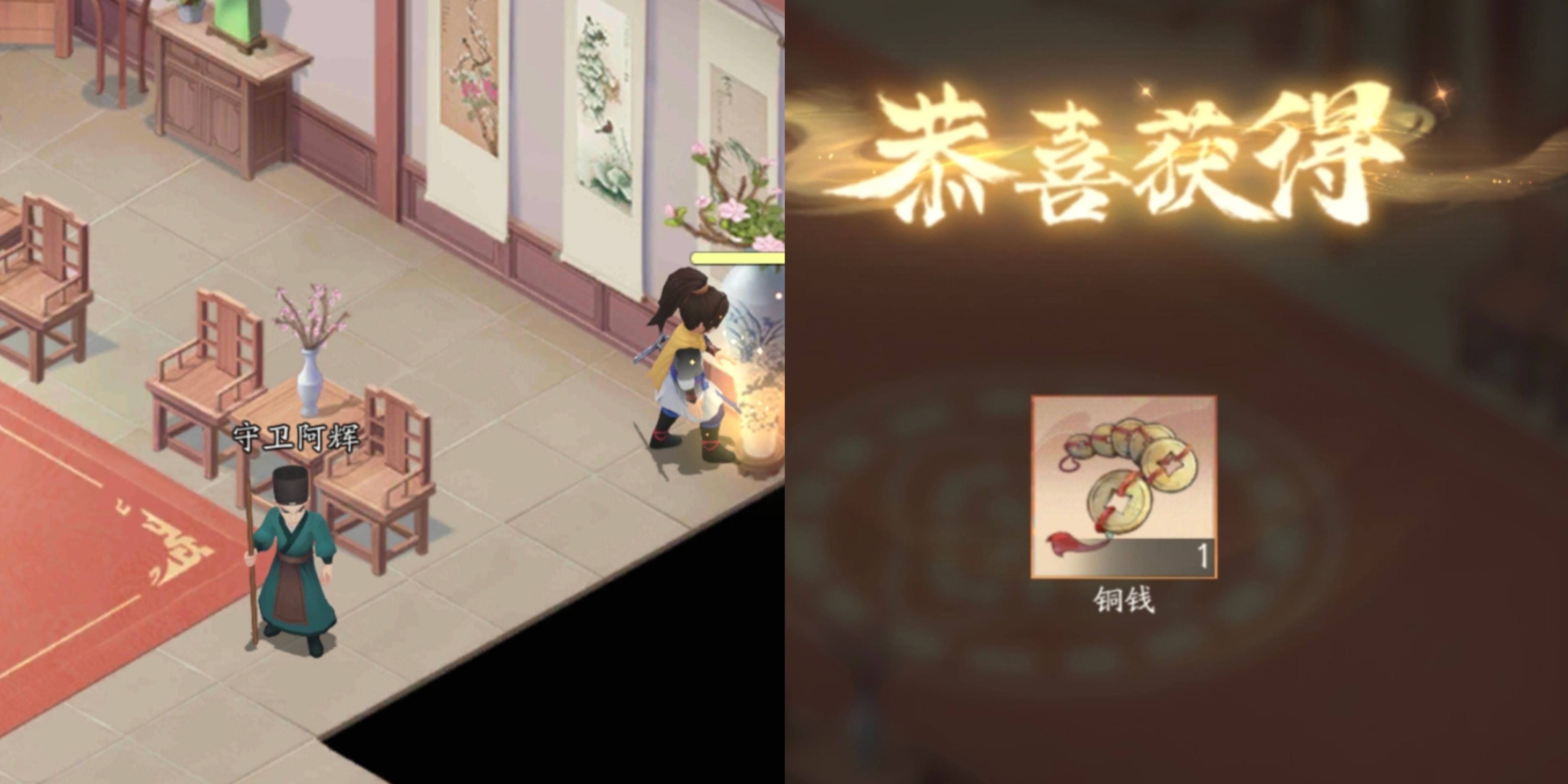 第一个铜钱获取地点在尚书府前厅的NPC守卫阿辉旁边的花瓶处。