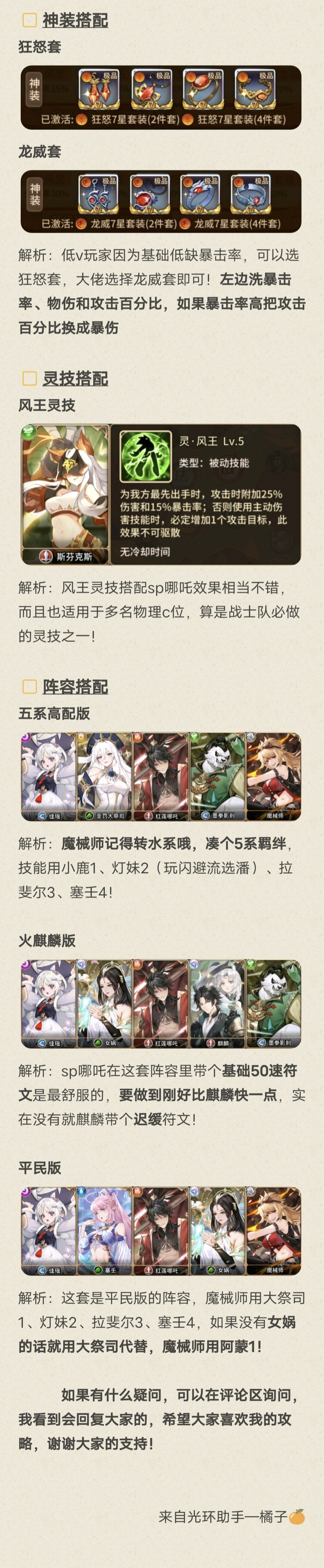 1.建议蓄力 2.sp哪吒变身跟不变身差距很大,变身推哪吒很好推,只需要确保他变身前别死就行了,坦克可以携带庇护 3.可以用辅助魔械师代替女娲,3技能带拉斐尔 4.sp熊猫必带,因为能给苟队有巨大的提升