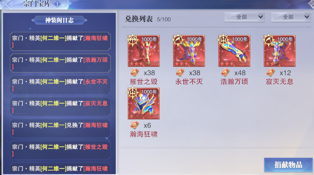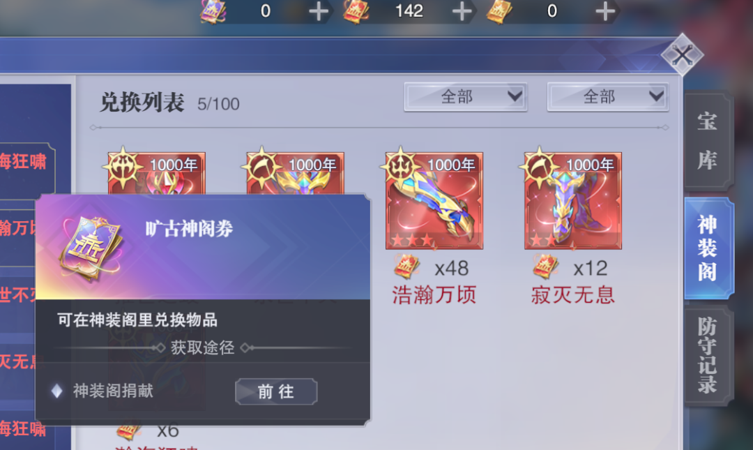 接着在宗门宝库中也上线了全新的神装阁,说白了就是让宗门成员可以各取所需的交换不同神装,交换的货币是神阁券,你捐献SSR神骨可以获得一般的神阁券,捐献SP神骨可以获得珍稀券,而至于下面图中的这个旷古神阁券维一还没有找到来源,难道说以后还会出彩色级别的神骨......