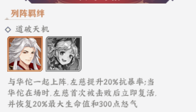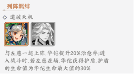 特点:左慈+华佗,周瑜+孙策。蔡文姬。都可互相激活上阵羁绊,大幅增加武将数值,周瑜+孙策可以开场合击提高输出能力,左慈+华佗可以施加复活+护盾,大大增强了抗打能力。 优点:输出高,前排抗打能力强。 缺点:初始4橙将养成成本太高,获取难度大,前期建议先心愿左慈+周瑜,一旦抽到左慈,先让他一星放在阵容内即可,心愿改为华佗+周瑜,开启特殊招募后里面选择孙策,前期没有武将时可以选择其他输出武将代替。 |