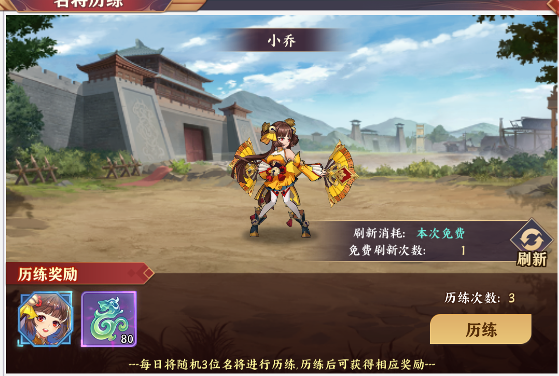 玩家每日可选择随机三名武将进行历练,历练完成后获得对应武将的将星以及将星精华