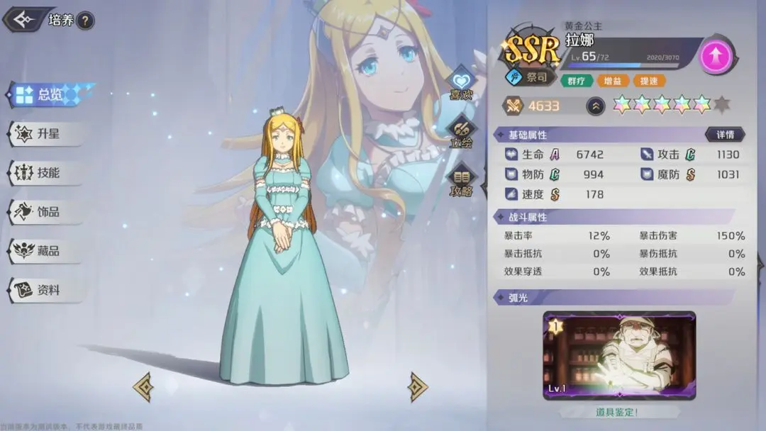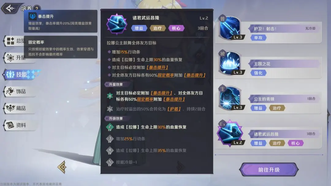 拉娜公主鼓舞全体友方,使其增加15%-25%行动条,同时造成拉娜生命上限30%-35%的群体血量回复。4星时,对主目标必定概率附加【暴击提升】,对其他目标有60%固定概率附加【暴击提升】,6星时,溢出治疗的50%可转化为护盾。
