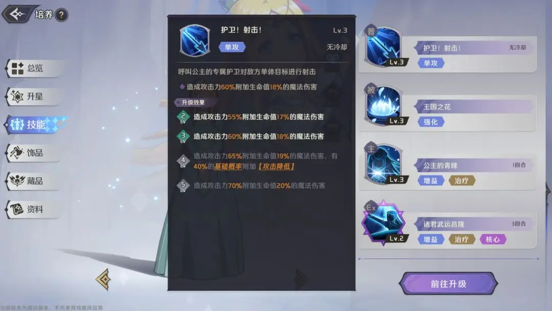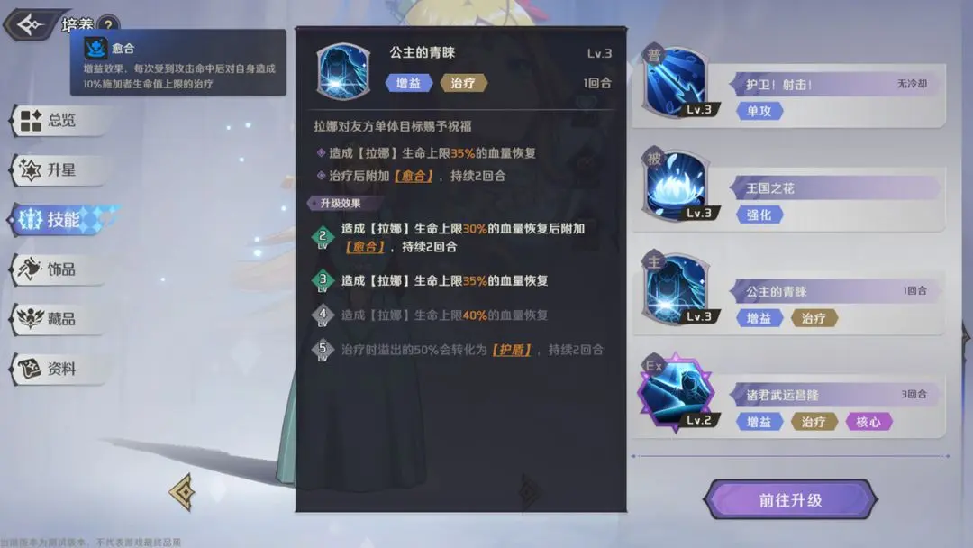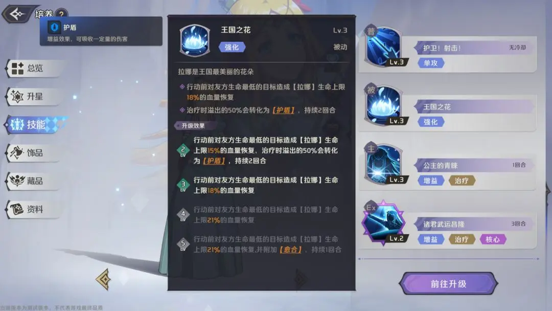 拉娜是王国最美丽的花朵,在行动前,对友方生命值最低的目标造成其生命上限15%-21%的血量恢复。技能2级时,溢出的50%治疗量会转化为护盾。