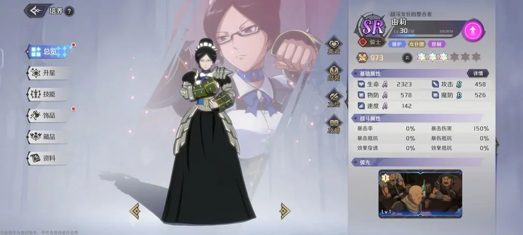 由莉初始位SR的角色,职业为骑士,定位为坦克。擅长援护、控制。所属阵营为业红。在上图的角色面板里,可以看出来,作为一个SR由莉的面板是很不错的,除了攻击c外,有三个A一个B都是骑士应该具备的属性。