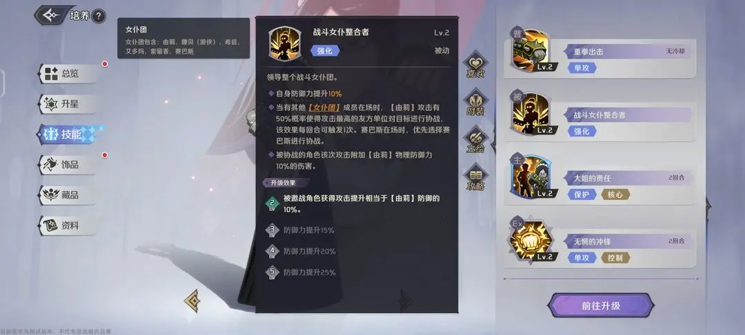 提升自身防御力的同时,要是队友同为女仆团的一员时会邀请攻击力最高的成员进行协战,赛巴斯上场时则优先邀请赛巴斯。升到2级被协战角色的攻击会携带由莉10%物理防御力,后续升级提升自己的防御力。