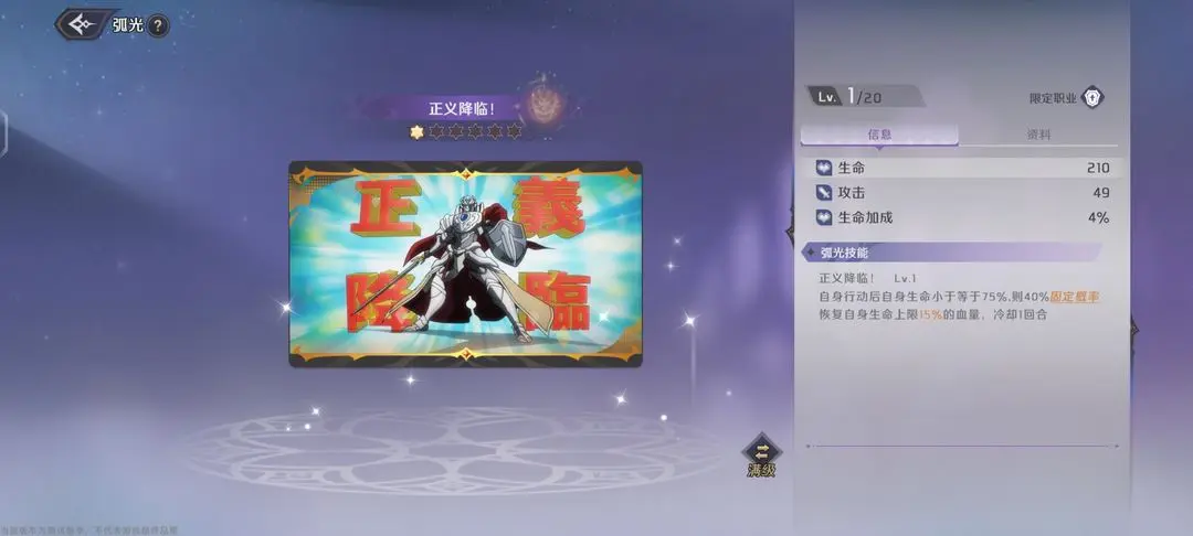 这里优先推荐【正义降临】,这个在自身血量小于75%,则有40%固定概率恢复生命上限15%的血量,升满则是100%。这个弧光可以说是适用于所有骑士的弧光,增加了续航能力。