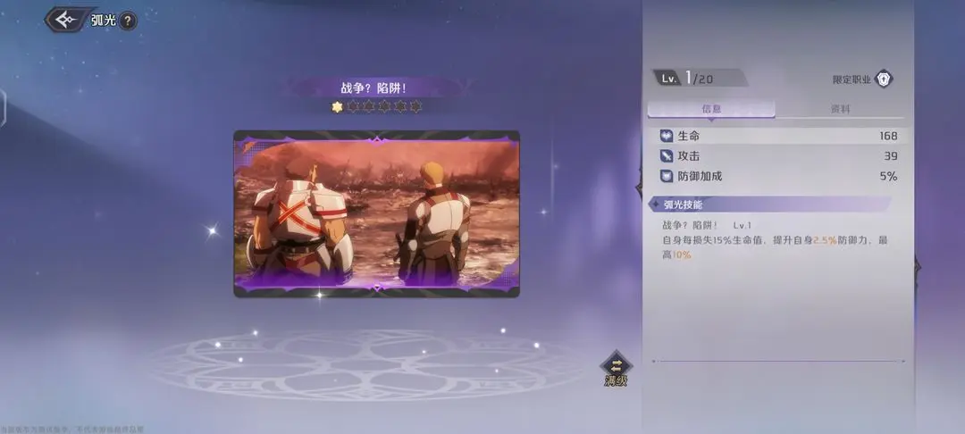【战争?陷阱!】这是第二推荐的弧光,失去15%生命值,提升自己2.5%的防御力,最高是10%,后期升星可提升防御数值。