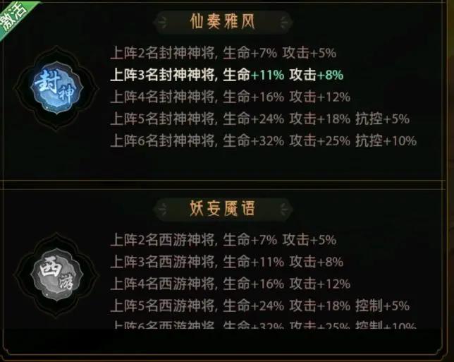 上阵不同数量的相同阵营神将会为战斗中的全体神将带来不同程度的属性加成,合理选择上阵神将,尽可能激活最大属性的阵营增益,将极大提高自身的胜率。具体阵营增益搭配可在布阵面板中点击阵营图标查看。