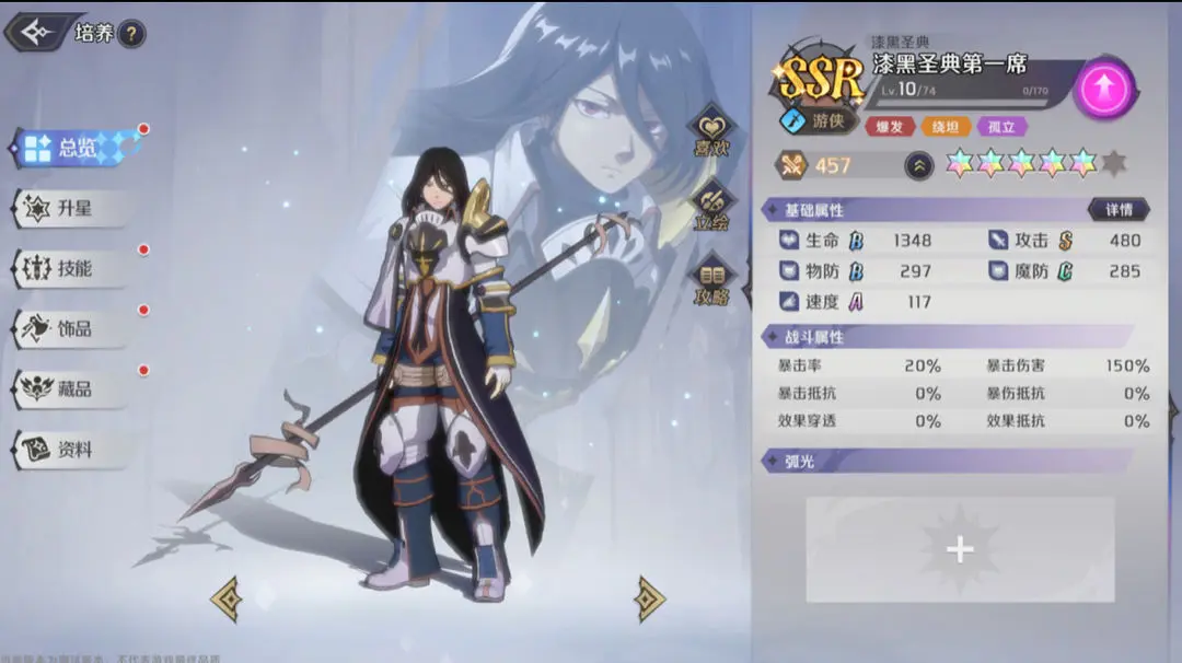 漆黑盛典第一席,SSR游侠,其核心特点是暴击,自身拥有高额的暴击几率和暴击伤害,同时还可以通过叠加【神人血统】的层数来获得更多的暴击伤害提升,同时具备多段攻击能力,叠满层以后完全可以一发入魂,秒杀脆皮轻而易举,可以作为后排杀手进行配队。