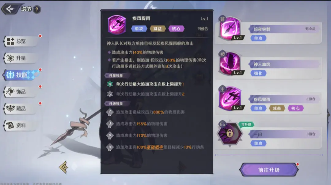 单体伤害技能,无冷却,技能等级4级时,会在暴击后叠加1层【神人血统】。