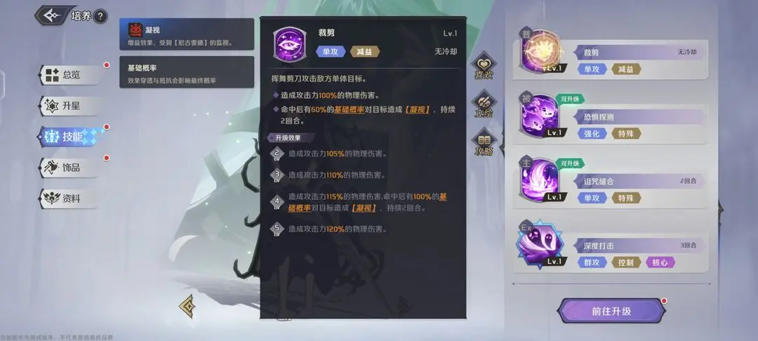 攻击敌方单体目标,造成攻击力140%伤害物理伤害。暴击后有100%概率使目标2个【减益状态】持续回合延长1,优先延长【不可行动状态】。后续升级,2级可以在释放诅咒缝合时获得20%暴击率,剩下的便是提升伤害和使目标的3个【减益状态】延长。