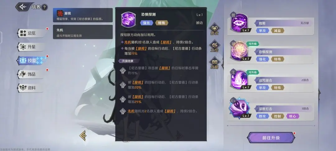 先机对随机一个敌人释放【凝视】,同时被【凝视】的目标行动时,尼古雷德的行动条会增加15%。到2级时尼古雷德攻击被【凝视】目标时暴击率会提升15%。后续升级技能会提升先机释放【凝视】的人数,也会提升尼古雷德增加的行动条。