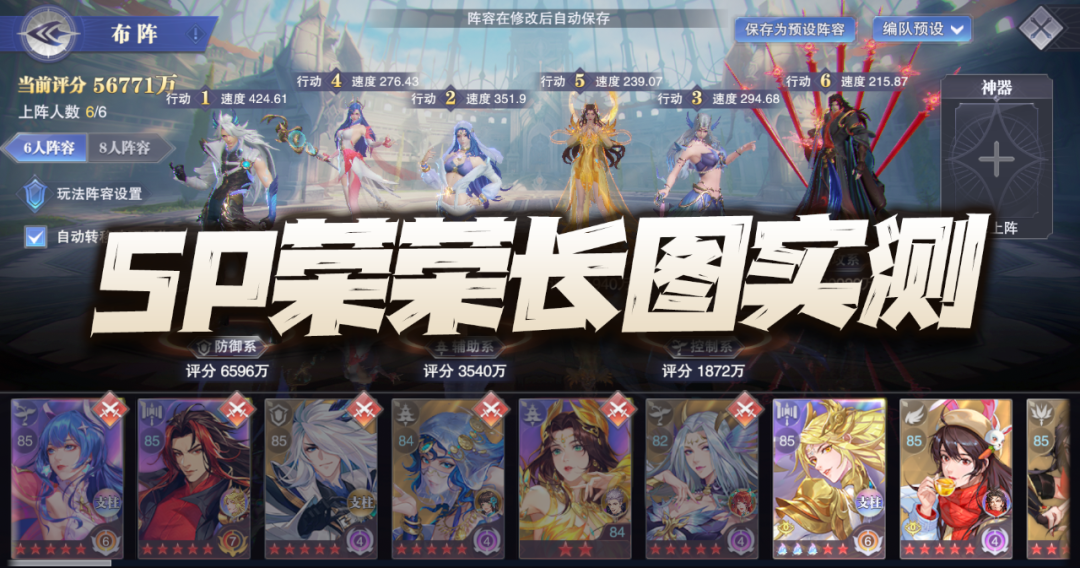 SP白虎队:这个白虎队主打的是快速打出1-2记录值,然后利用全队普攻来打后续伤害,但SP荣荣的【神恩】buff是需要不短时间积累的,因此在这点上有一定冲突