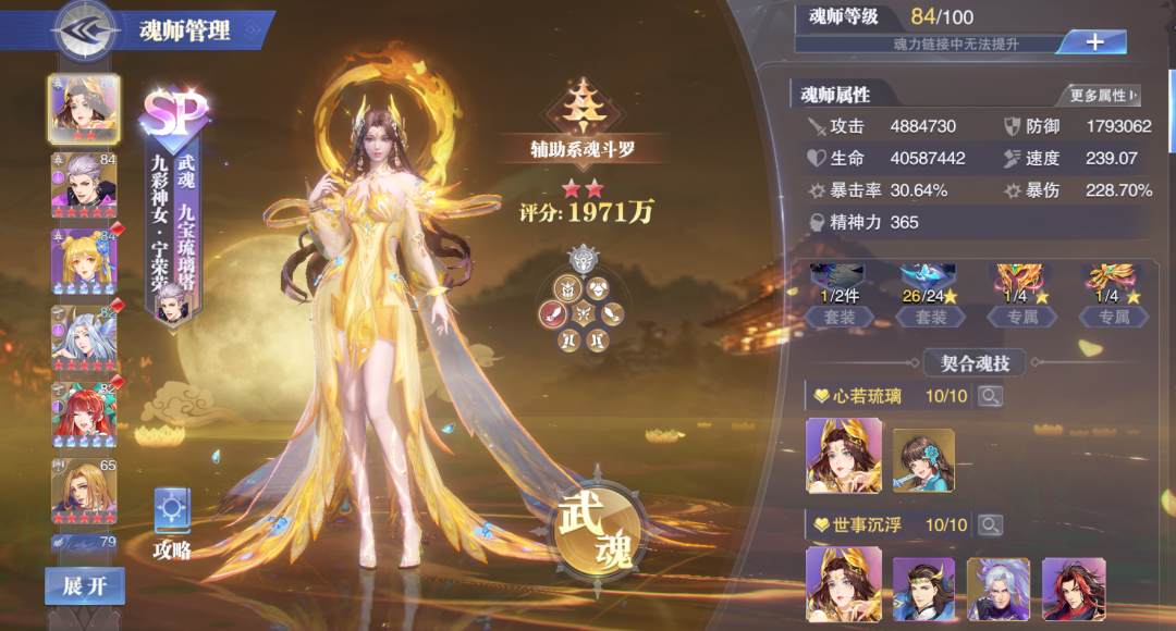 接着简单说下SP宁荣荣的长图配置,魂环11X1+5/6增伤魂环即可(例如云中鹤),加点务必选择精神,因为SP荣荣本身就有两个可以加速的契合关系,其一是按照【神佑】层数来提升其六维属性,其二是战斗开始推动30%辅助系魂师行动条,而如果大家现在依然是在用海马的赐福打法作为队伍发动机,则很有可能SP荣荣会超过海马导致其无法顺利打出稳定两连赐福的表现,因此荣荣的加点一定要加精神,魂环属性也尽量选择精神。