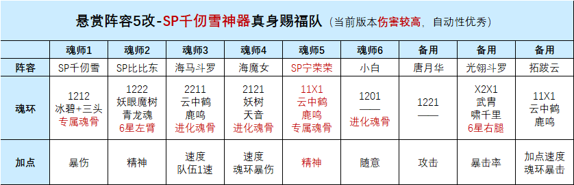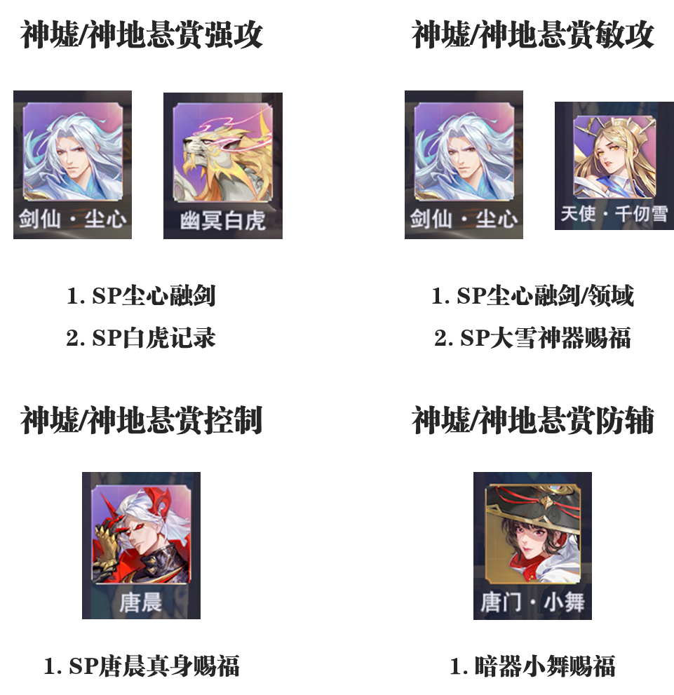 基本上目前比较主流的神墟/神地悬赏的四大boss打法就是以上6个,接着我们一个一个来说SP宁荣荣的特点,首先是经过昨天测试后维一感觉不太合适的有:暗器小舞队、SP白虎记录队,大家这里注意不太合适不代表不能用,只是其中会有一些不是那么匹配的地方,这里简单说下原因,当然各位有解决之道的话也欢迎给维一单独说说: