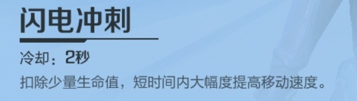 战术闪电冲刺:可以短时间大幅度提高移动速度,在复杂地形的时候可以快速绕圈圈,无论乘机背后偷袭,还是逃跑,都非常好用。而2秒的冷却可以说是无限加速了~