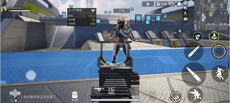 尖刃冲锋枪伤害区别为头、上半身和腿,距离衰减为65-90-200M。在训练场测试显示如下: