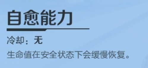 被动自愈能力:没有交火的情况下,可以自动回血!别人和你火拼,大家都剩一丝血,他在打血,而你在打甲;他血刚刚满,你甲和血都满了!这时候给你一梭子,请问阁下该如何应对?