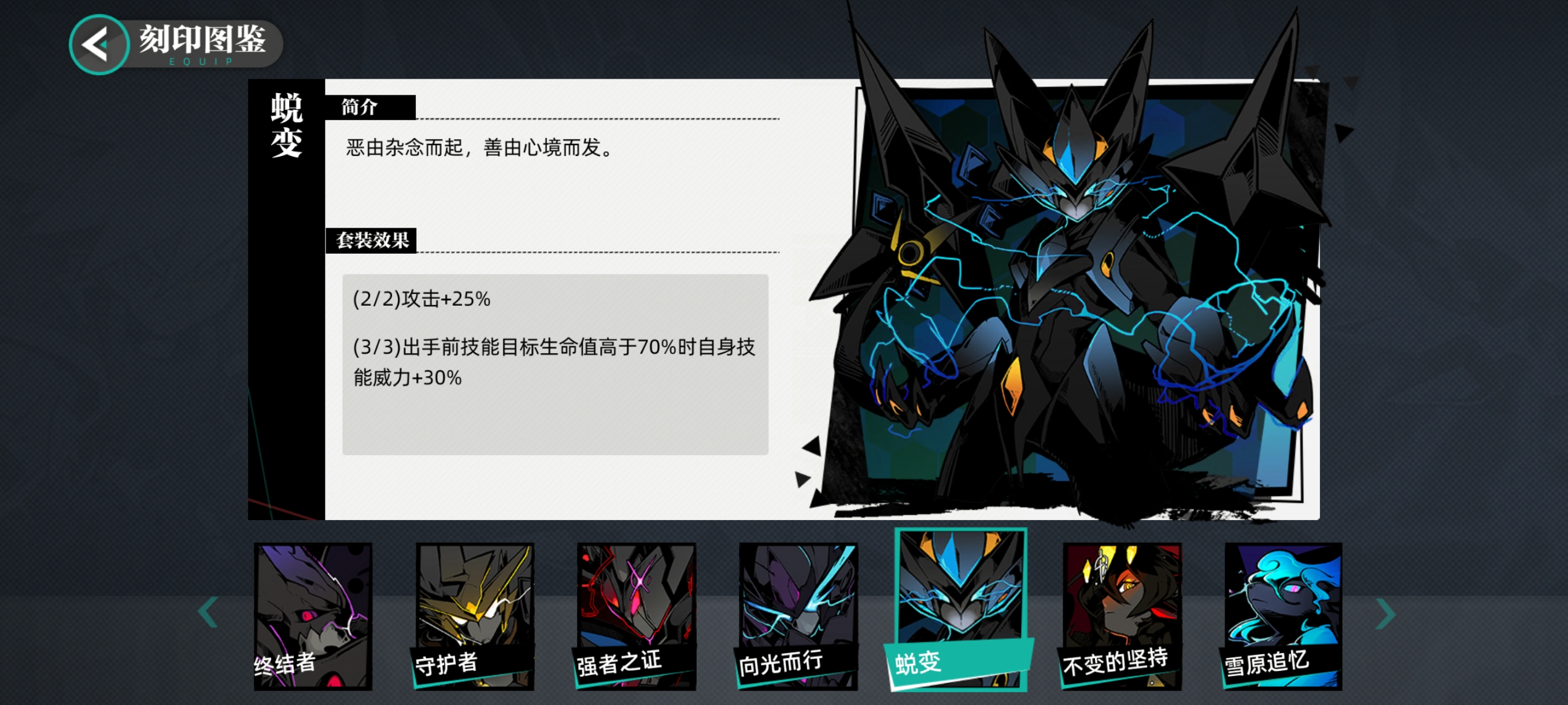 不变的坚持2件套,最好是不要换别的,因为蜕变的机制也是吃速度的,加上蜕变也主要活跃在竞技场上,副套用速度更为对胃。