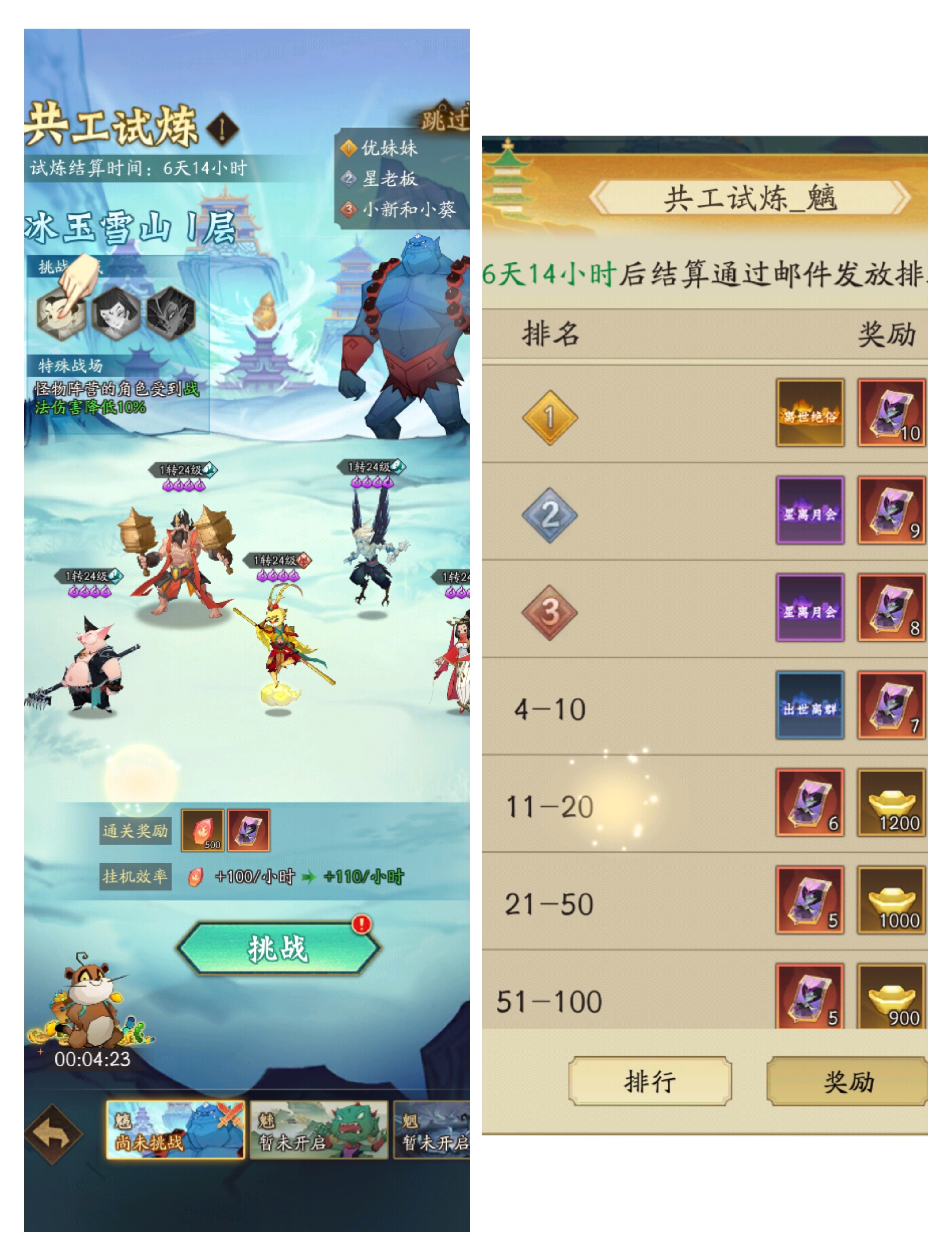 通过挑战能获得通关奖励,同时能挂机获取额外的资源。
