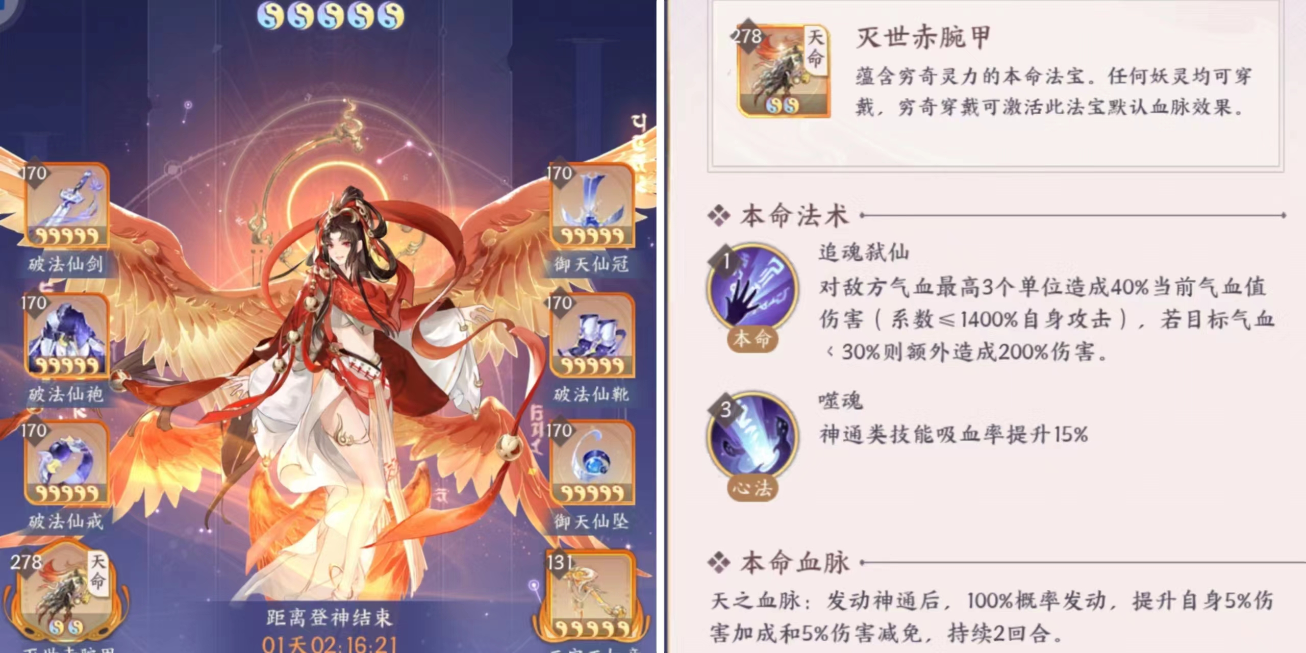 可以看到穷奇的天命法宝是可以造成40%当前生命的真实伤害,所以很多人朱雀选择带【灭世赤腕甲】,其他2个天命法宝的天赋效果就是辅助的作用了。