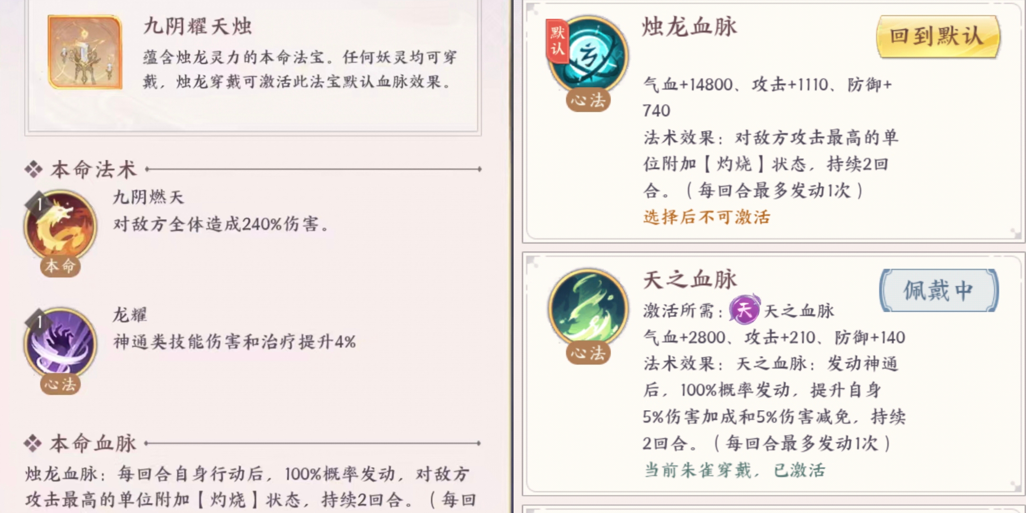 【耀天烛】法宝,原有的血脉为烛龙的效果,烛龙佩戴是可以挂灼伤状态的,但是如果激活了其他血脉效果,给其他妖灵带,这个灼伤效果将会消失。或者血脉效果不变,给其他妖灵佩戴,这个灼伤效果也是无法存在的。
