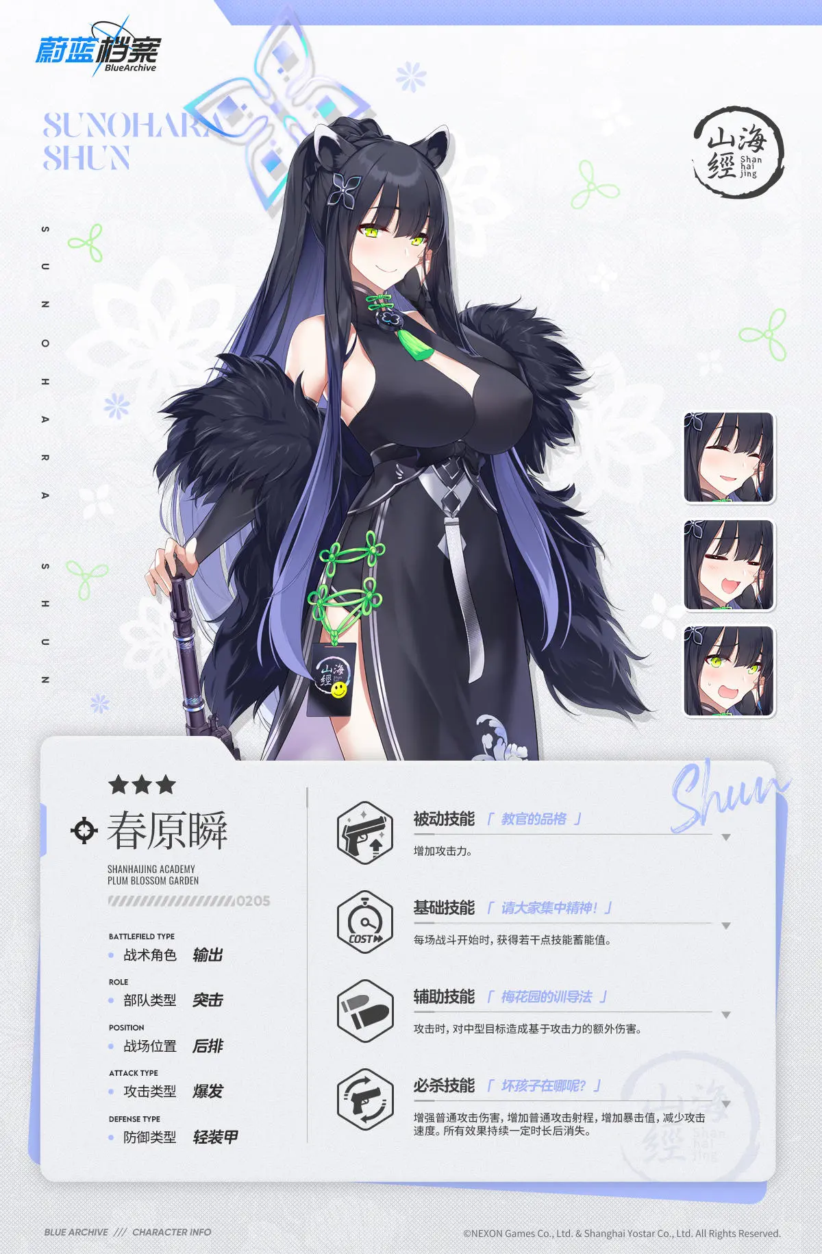 【人物档案】春原瞬白喵岚岚发布于 2023-07-19关注 //////////档案启封//////////■春原瞬山海经训育支援部——梅花园的教官。她是梅花园培训小朋友的教官,因其温柔宽厚的品性,不仅是梅花园的小朋友,连山海经的其他女生们也对她非常信任。长久以来一直做教官的她,很少会因为小朋友们的恶作剧发火,但对提及自己的年龄非常敏感。“呵呵,要认真看姐姐的示范哦。”