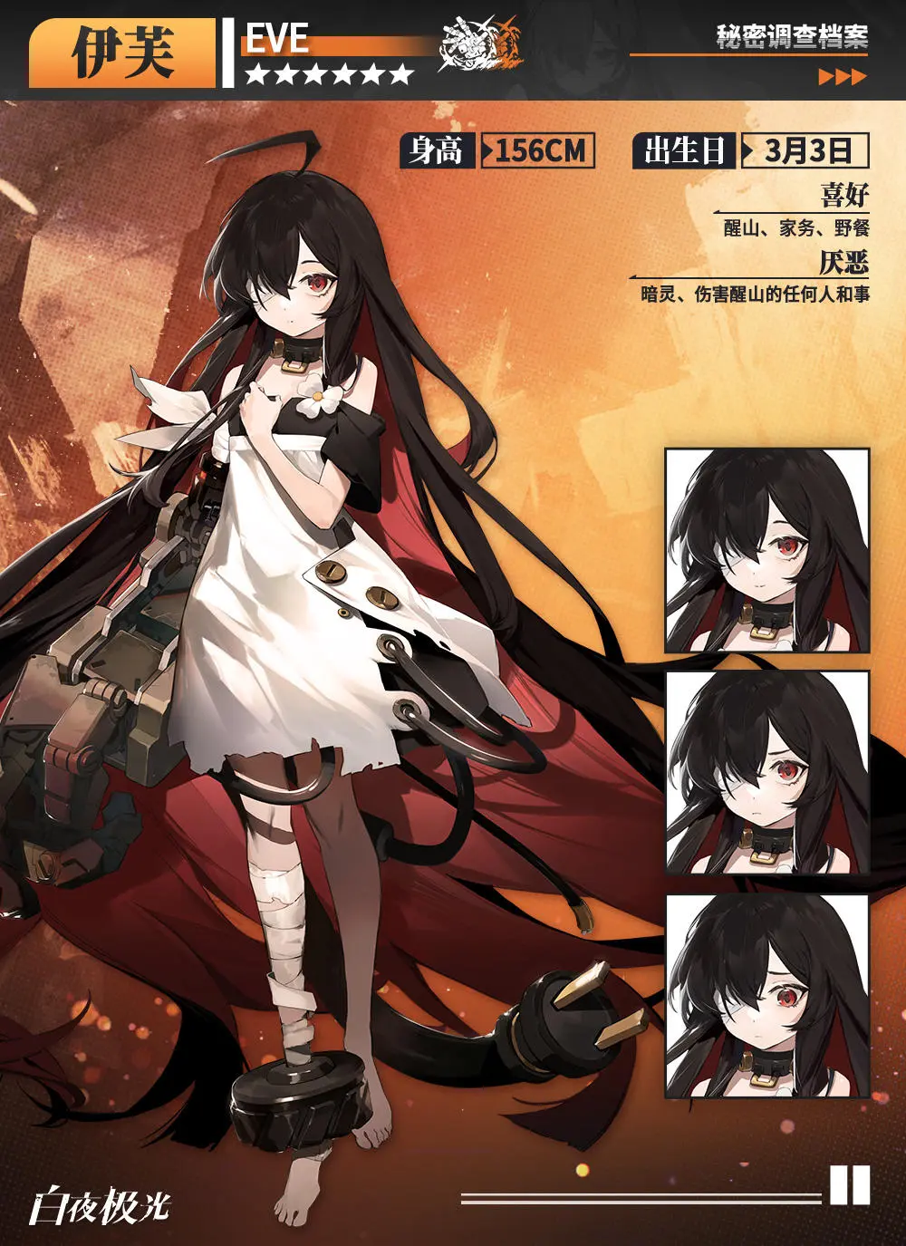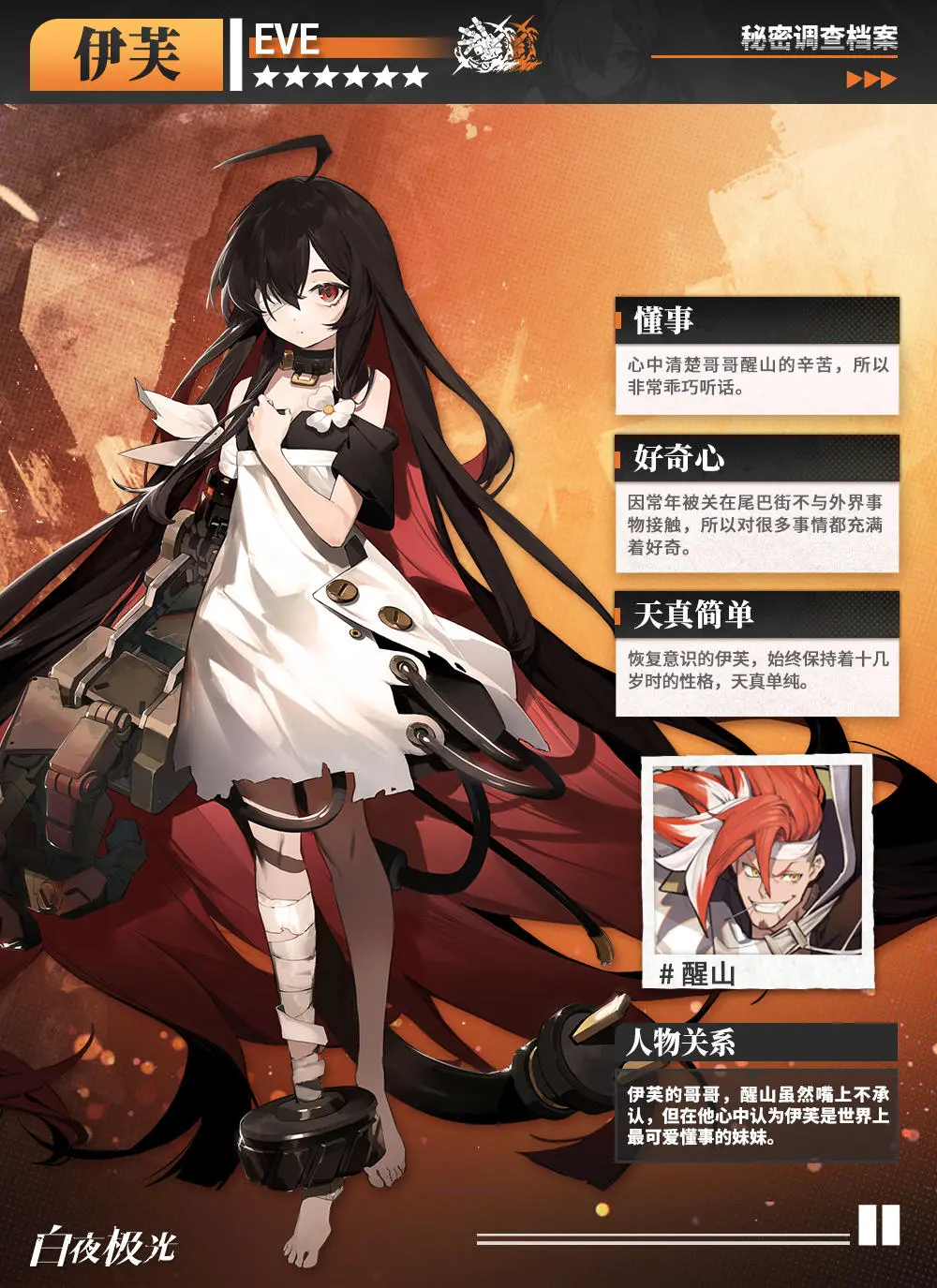 红油扳手首领醒山的亲生妹妹,与哥哥醒山相依为命。在幼年的“疾病”被治愈后,性格逐渐变得开朗起来。虽然体能很弱,但是伊芙可以操控强大的光能术。