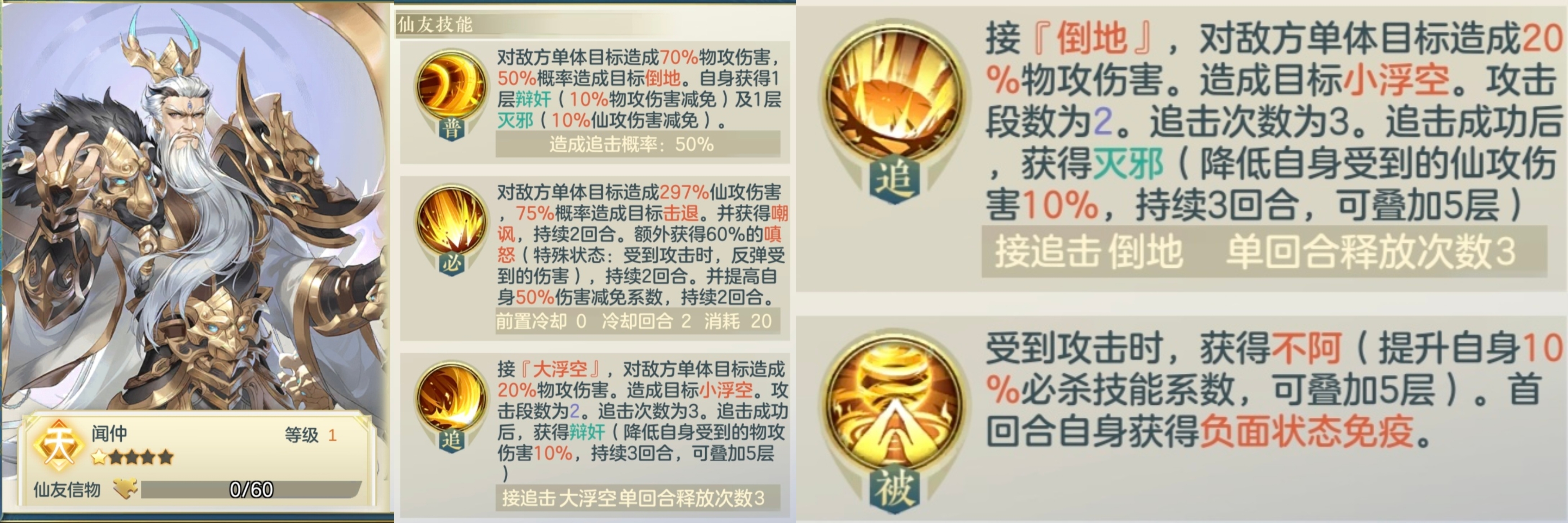 闻仲单体输出,击退倒地控制效果比较多,通过控制的衔接机制使其可以打出更多的伤害。自身坦度较高,辩奸与灭邪能够降低敌方双攻。免疫负面的同时,自身具有较高的伤害减免,能够为队伍扛下更高的伤害。