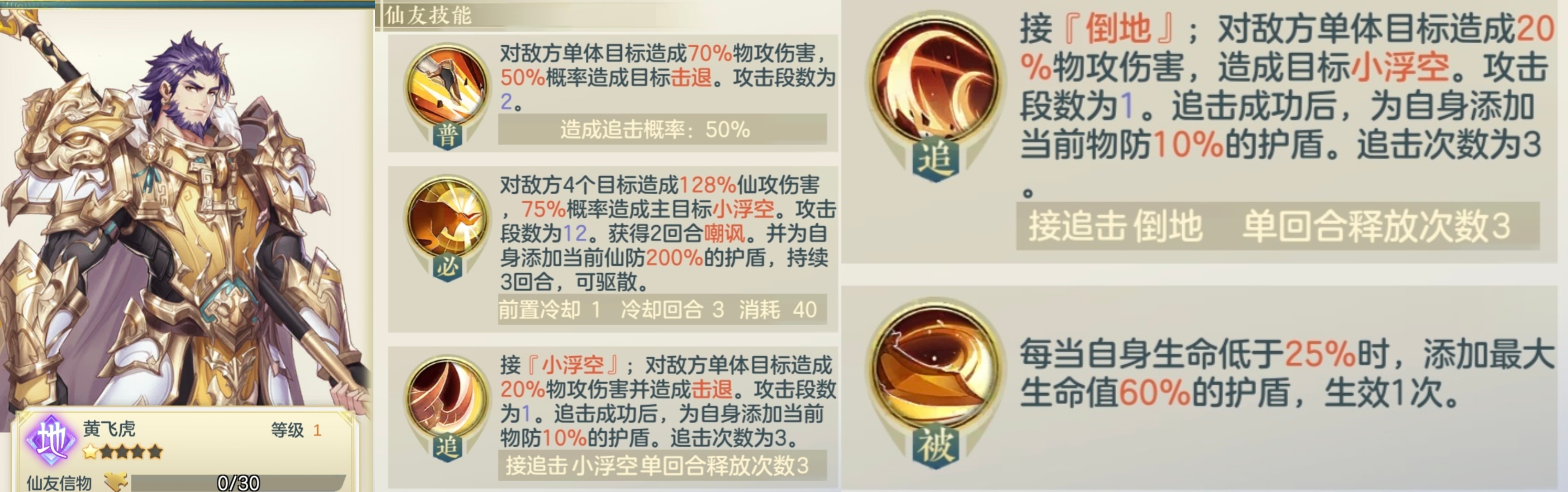 黄飞虎群体伤害,同时附带嘲讽,造成击退,通过多段技能为自身上盾,提升自身生存能力。生命低于一定百分比时,触发保护盾。