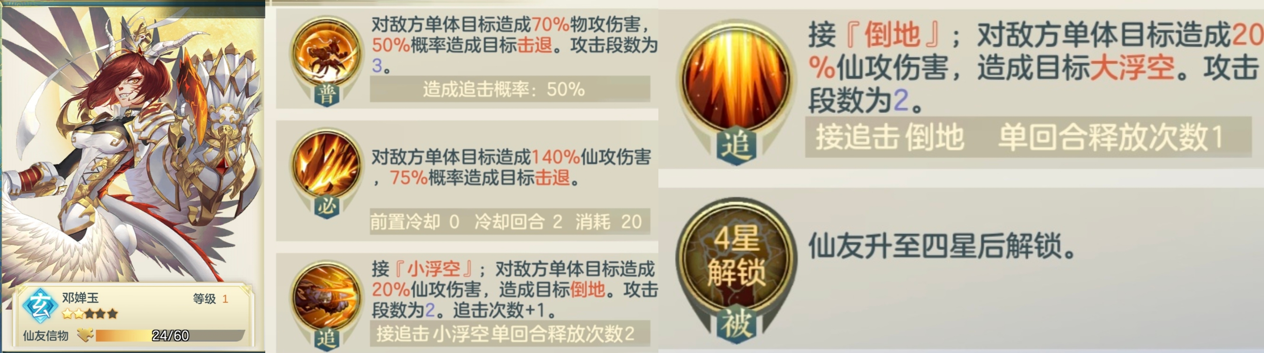 邓婵玉追击队的核心之一,单体伤害及击退,以及额外具有倒地效果,追击则衔接倒地,造成大浮空伤害。四星被动为提升追击伤害系数,对这个英雄追击的一个大加强。