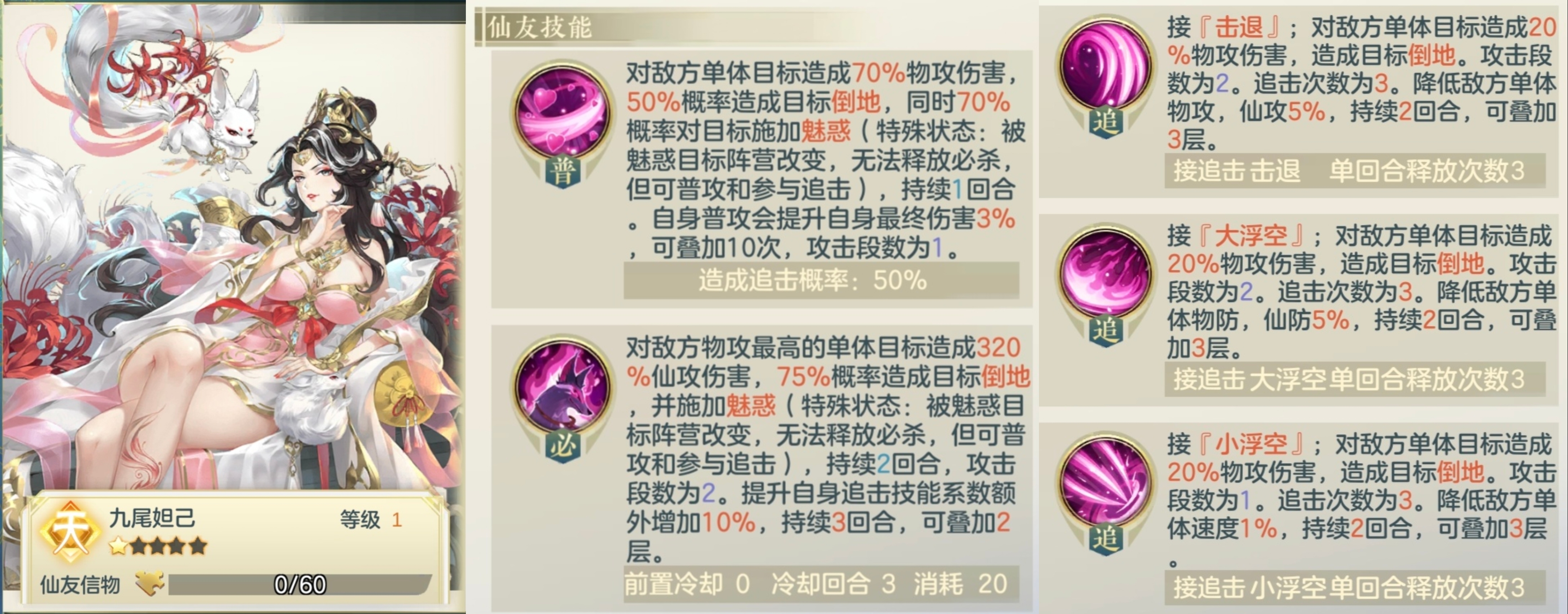九尾妲己技能机制很丰富的一个英雄,已知相对应的是其高强度。普攻单体伤害,倒地魅惑,以及通过此增加伤害,提升追击系数(两者上限都为10层)。击退降低敌方双攻,倒地降低敌方双防与速度,能够营造良好的输出空间,实现输出最大化。