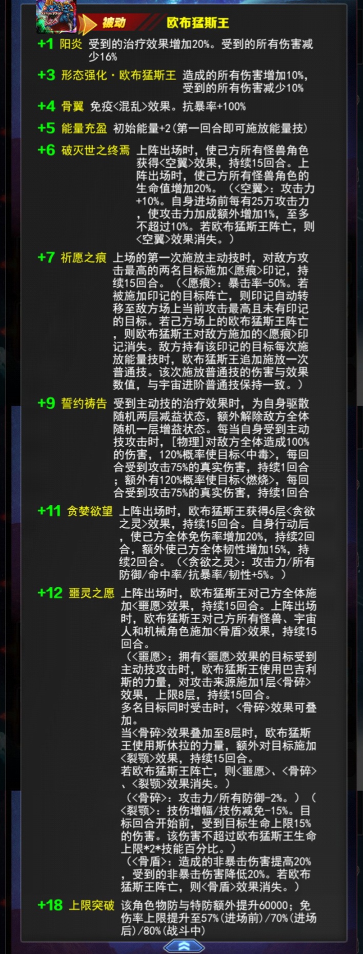 +11 贪婪欲望上阵出场时,欧布猛斯王获得6层<贪欲之灵>效果,持续15回合。自身行动后