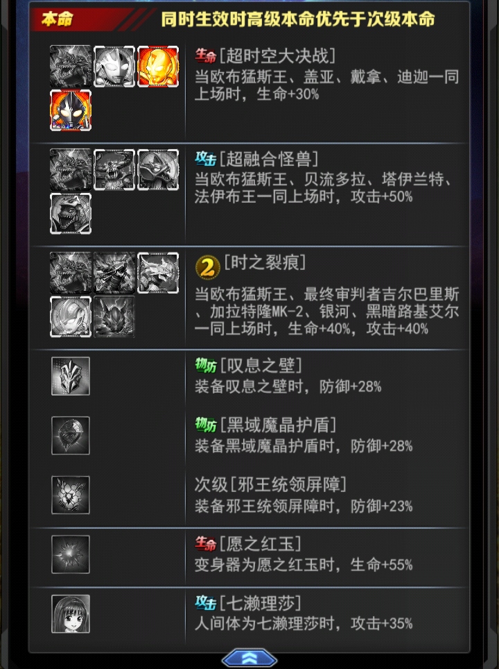 解析:对全体生效,但是附带骨髓和骨裂需要叠到叠满之后可以减少敌方16%的攻击防御,并对敌方15%击杀减免与增幅,并且每回合收到敌方受到15%生命上限的伤害单加12的鼓动减抗暴飞暴击伤害的效果是不对奥特曼生效的,这一点就很不好。从这个被动来看这样的话用来辅助是很不错有高额的减免和伤害加成。单推效果也还行,就是没有辅助来的很好