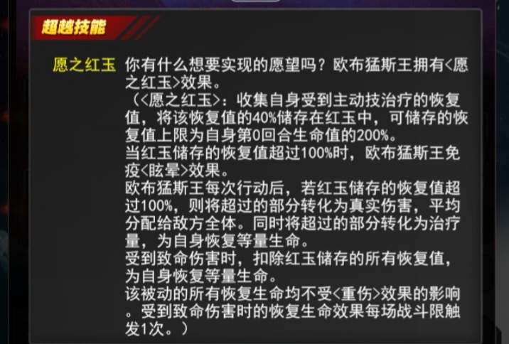 欧布猛斯王每次行动后,若红玉储存的恢复值超过100%,则将超过的部分转化为真实伤害,平均分配给敌方全体。同时将超过的部分转化为治疗