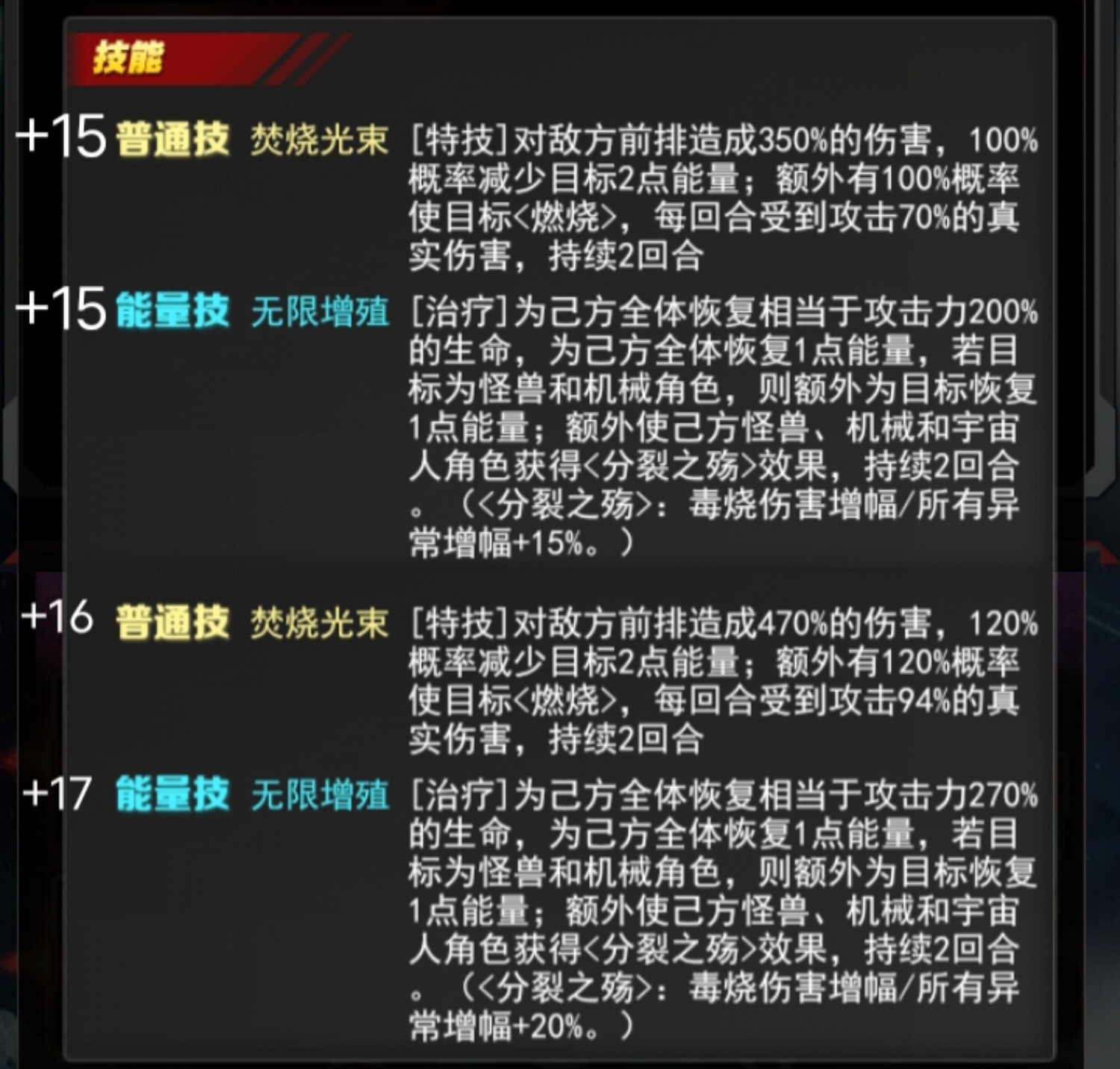 +16 普通技焚烧光束[特技]对敌方前排造成470%的伤害,120%概率减少目标2点能量;额外有120%概率