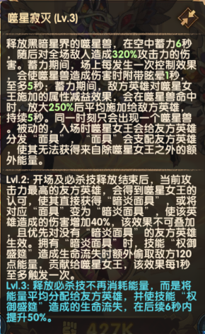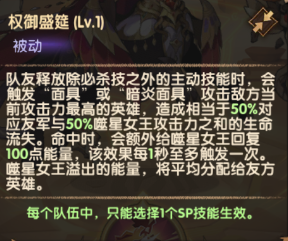 队友释放除必杀技之外的主动技能时,会触发面具工具敌方英雄,造成生命流失伤害,额外给女王恢复100点能量,女王能量溢出,则平均分配给友方英雄。