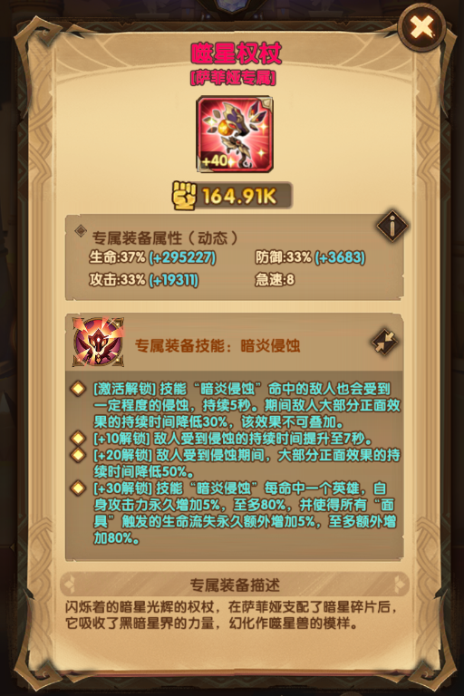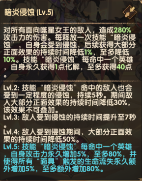 20专属技能命中的敌人会受到侵蚀,大部分buff持续时间降低50%;30专属技能每命中一个英雄,自身攻击力提升,面具触发的生命流失伤害提升。
