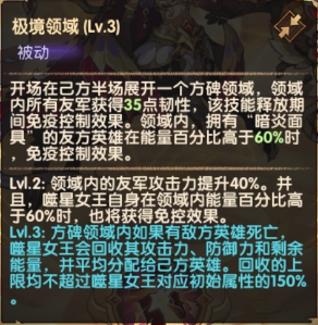 3红家具领域内的友军攻击力提升40%且SP女王在领域内能量百分比达标时,也将获得免控效果,提升可观值得投资。