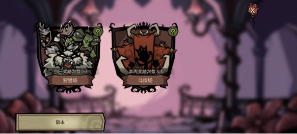 【副本挑战界面】 副本挑战主要分为狩猎场和斗技场两大模式。 不论狩猎场还是斗技场,冒险家都可以带战备箱(也就是初始武器和护甲)进入副本。冒险家可以点击头像来到角色属性界面,点击下图红色框框的图标进入战备箱界面。