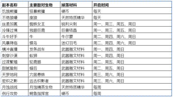 【狩猎场】 在狩猎场中,会有如下副本挑战内容,有些是限时的,比如下面的“饥饿熊獾”和“不绝狼嚎”是全天开放的,而下面的副本挑战内容是有时间限制的,具体副本名称,主要敌对生物,掉落材料和开启时间如下表。各位冒险家需要注意好时间进行挑战。