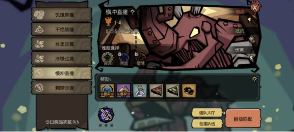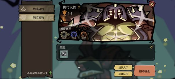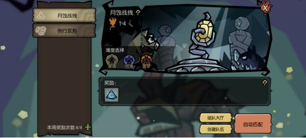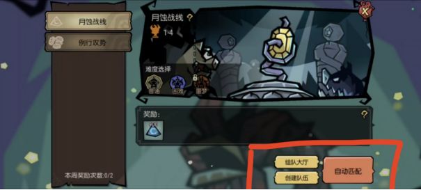【月蚀战线】 大部分冒险家看到这里都跃跃欲试了吧,不要着急,这里还为大家提供了副本挑战攻略,本期提供副本“月蚀战线”的攻略! 在“月蚀战线”主界面有组队大厅,创建队伍和自动匹配三个选项,各位冒险家按需选择。