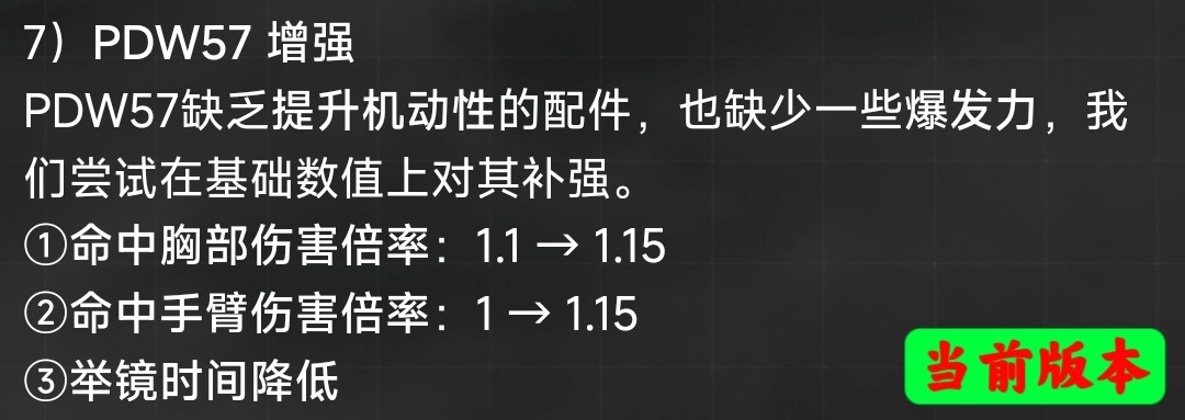 PDW57作为一把中速冲锋枪的代表,拥有着信仰之枪-P90的称号!凭借着50发子弹和后坐力的稳定,不仅有众多兄弟,也曾排位叱咤风云。随着时间推进,面对一众爆发极强的冲锋枪,需要找回曾经的感觉!虽然之前有增强过射程,但中段距离依然爆发不够。在本次版本中,大幅度提升熊、手臂的伤害倍率,配合他不俗的稳定性,信仰之枪又回来啦!