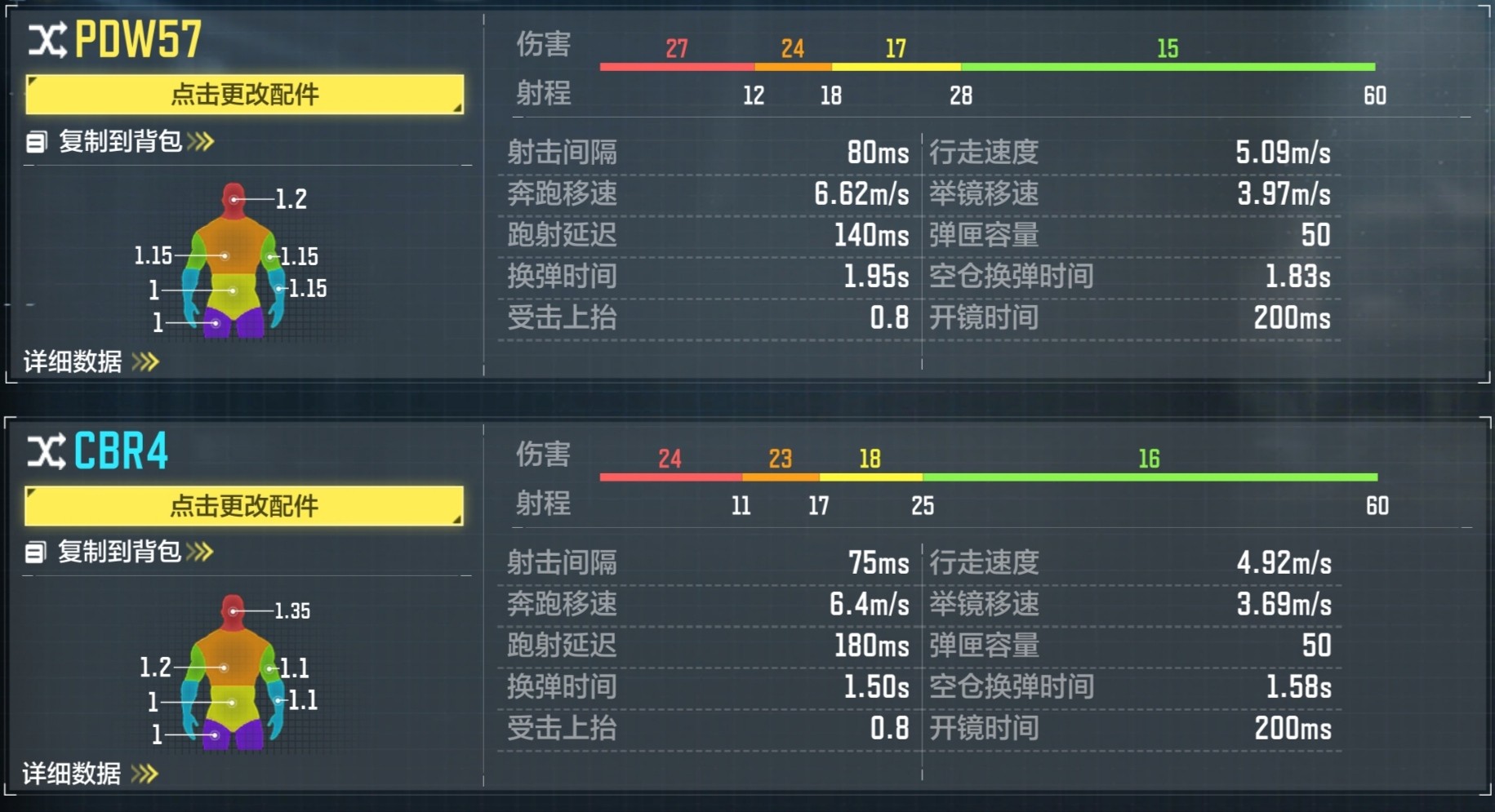 在当前版本中,PDW57同样拥有4段射程,伤害整体呈滑梯式衰减。第一段射程27点伤害,因伤害倍率较低,所以大多数中速冲锋枪一样全身4枪倒,比起CBR4的高爆发,吃了5ms的亏,略有不如!而增强之后在第二段射程4枪致命率比CBR4高很多。而在第二段射程之后,PDW57伤害直接进入6枪范围,衰减严重,暂不考虑。因此想要发挥PDW57优势,需要大幅度提升射程,使前2段射程拉长。才能吃到中距的优势伤害!