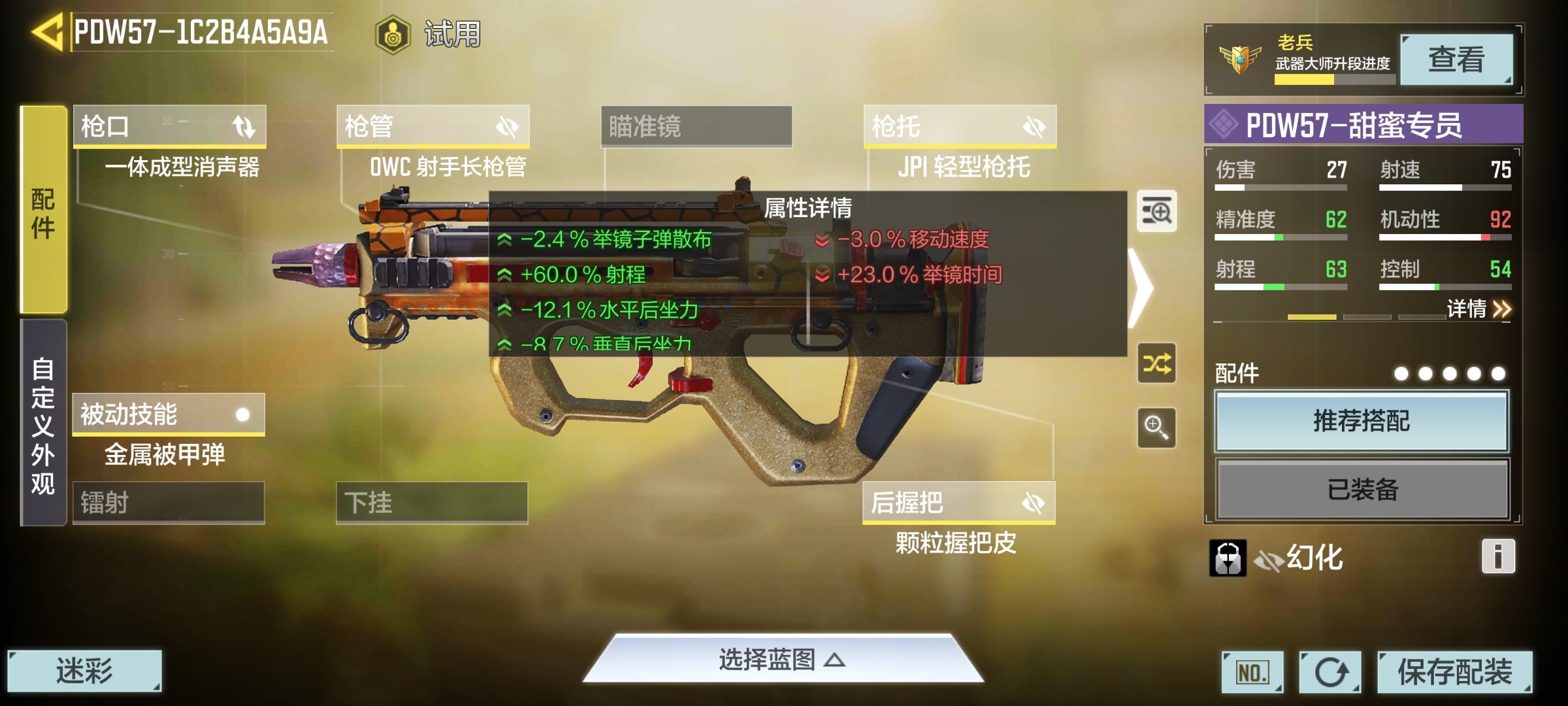 经过多次测试,老狼终于搭配出最舒服的枪械配件: PDW57核心射程和TTK选择特一体成型消声器和OWC射手长枪管来将致命射程提升到28.8,之后则选择JPI 轻型枪托来给予滑板鞋的能力!由于中距作战,佩戴颗粒握把皮非常合适。最后给到金属被甲弹提升复杂环境的容错率,或则使用快&手提高应急能力都是可以的。如果和老狼一样无法适应机瞄的话,可以将金属被甲弹换成红点瞄准镜就可以啦~